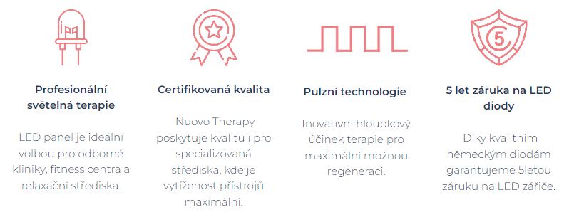 Využití biologicky nejúčinnějších vlnových délek je klíčem k optimalizaci přínosů terapie červeným a blízkým infračerveným světlem. Vlnové délky 630 + 660 nm červeného světla a 830 + 850 nm blízkého infračerveného světla obsažené v panelech Nuovo Therapy, jsou známé pro své jedinečné terapeutické a regenerační výsledky, které tělu nabízejí. Kombinací těchto čtyř vlnových délek se speciálními čočkami zalamující jejich svit do úhlu 30 stupňů vám přinášíme nejvýkonnější a nejpokročilejší zařízení pro fotobiomodulační terapii LED světlem na trhu.